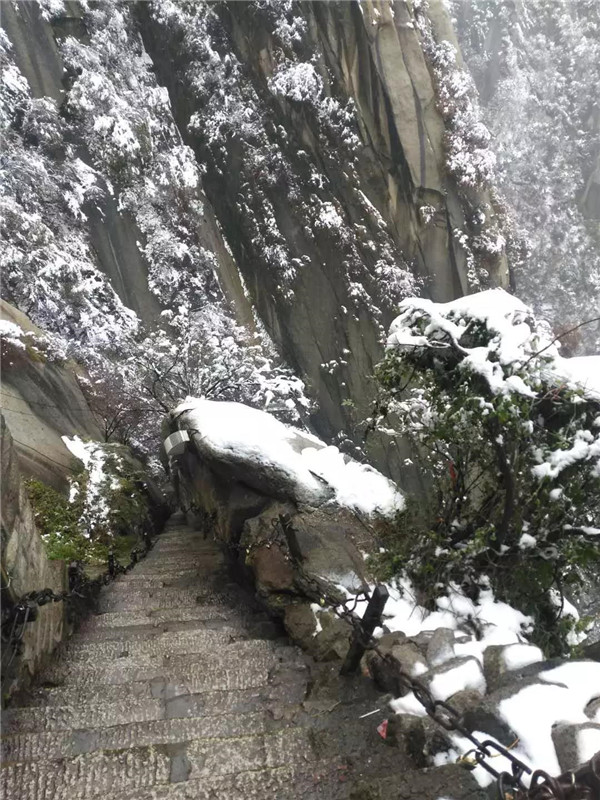 大概到了千尺幢,路就非常陡峭了,幾乎垂直攀登。戴上手套,登山杖收進背包,抓緊鐵鏈子,懸崖外寒風(fēng)呼嘯,雨雪交加,絕壁上的古松巍然屹立,驢友相互鼓勵有說有笑,天冷,但心是熱的。