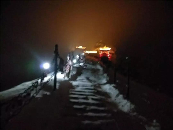 一直往上走,天色漸漸暗下來。和路上遇到的兩位山友告別后,我一個人繼續(xù)走,路面都是積雪,有的還結(jié)冰了,只好綁上冰爪,打開手電,偶爾抬頭看看被白雪浸染的山林。忽然,前面山頂上一片燈火輝煌,不知道那是不是天上的宮闕?