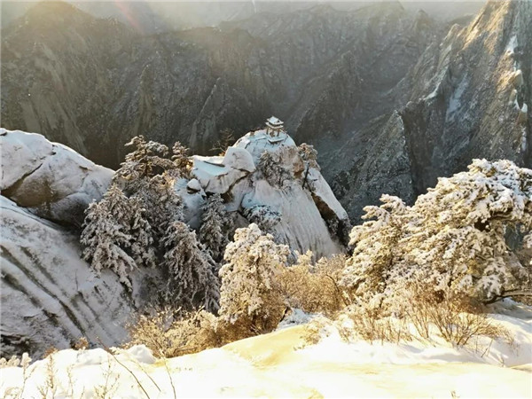 過后,又看到了下棋亭,長空棧道,華山松,西峰,南峰。想到金庸先生,想到“華山論劍”,“飛雪連天射白鹿,笑書神俠倚碧鴛”,伴隨了中國幾代人的武俠情懷。這里,金色的陽光,湛藍的天空,皚皚白雪;站在南峰仰天池上,左手秦嶺群山,右手八百里秦川,這就是華山之巔!