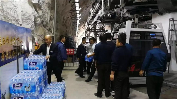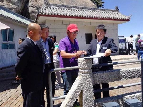 其實,雷科峰平時對大家要求挺嚴的,職工背后議論說雷科峰有一種軍人作風,凌厲、硬氣,大家跟上他干事活多還辛苦。印象最深的是那一次美化南天門“三間房一頁瓦”附近的臺地??油莶黄降呐_地上原來蒙著一堆土,晴天一層灰,雨天滿地泥,冬天雪泥一凍一消,平臺就成了沼澤,不說過來過去行走不便,看起來也讓人不舒服,游客常常一不小心就濺得滿身的泥水,很掃興,雷科峰下決心美化平臺。美化平臺所用的沙子、石子、水泥要到二三里路遠的溝底去背。從山頂?shù)綔系祝宦飞先橇⑵露秆?,雷科峰領著十幾名職工利用六天的工余時間,硬是把近二十噸的沙石背了上來。背料過程中,有的職工肩膀磨破了,有的雙腿像篩糠一樣抖個不停,許多職工中途不敢蹴下來休息,怕一蹴下就再也站不起來了,歇息時把沙袋子擱在路邊的石坎上,人站著緩口氣……一個個汗流浹背,氣喘吁吁。