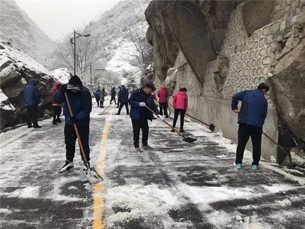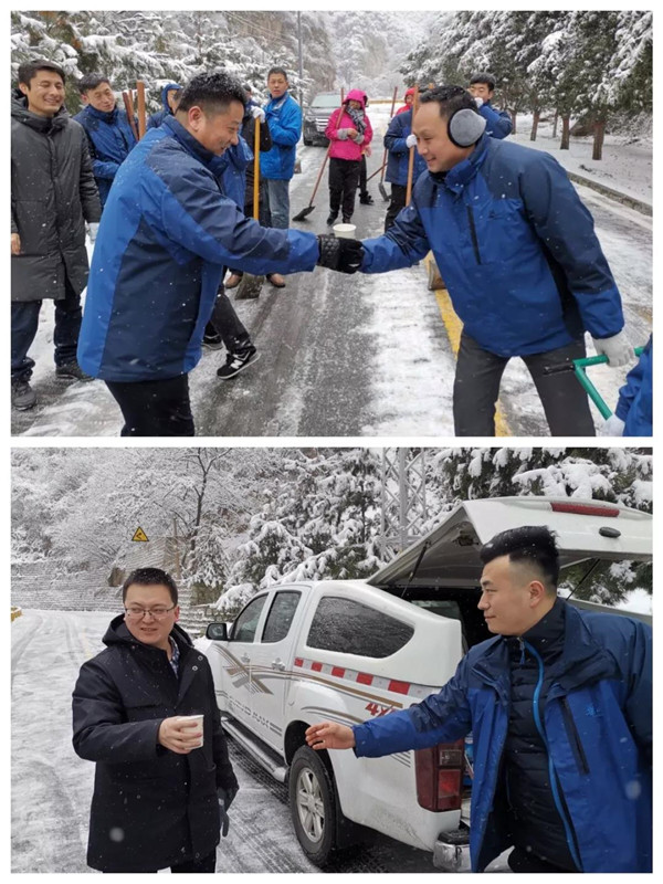 1月31日凌晨景區(qū)出現(xiàn)強降雪天氣,道路積雪嚴(yán)重影響行車安全。華旅集團(tuán)第一時間多渠道發(fā)布景區(qū)推遲運營時間的信息,并向游客做好解釋工作,同時號召集團(tuán)各部室、各單位迅速組織人員赴進(jìn)山公路進(jìn)行掃雪除冰,經(jīng)過三個小時的全力清掃,東線進(jìn)山公路積雪清理完畢,景區(qū)在短時間內(nèi)恢復(fù)運營,西線索道進(jìn)山公路及華山峪區(qū)域不斷加大清掃力度,盡力實現(xiàn)景區(qū)全線貫通。
