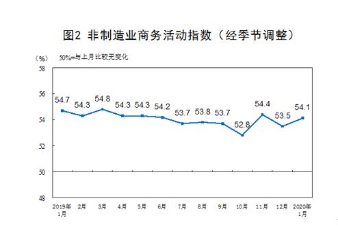 2020年1月份,非制造業(yè)商務(wù)活動(dòng)指數(shù)為54.1%,比上月上升0.6個(gè)百分點(diǎn),表明非制造業(yè)總體保持?jǐn)U張。