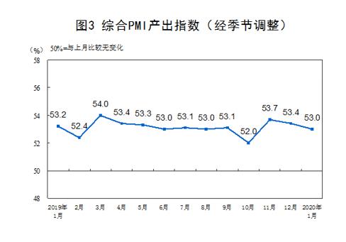 國(guó)家統(tǒng)計(jì)局今日公布數(shù)據(jù)顯示,截至2020年1月20日,采購經(jīng)理調(diào)查結(jié)果顯示, 1月份,中國(guó)制造業(yè)PMI為50.0%,非制造業(yè)商務(wù)活動(dòng)指數(shù)為54.1%,綜合PMI產(chǎn)出指數(shù)為53.0%。