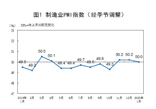 2020年1月份,中國(guó)制造業(yè)采購經(jīng)理指數(shù)(PMI)為50.0%,比上月小幅回落0.2個(gè)百分點(diǎn)。
