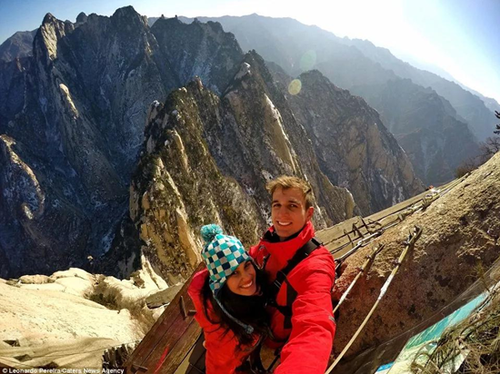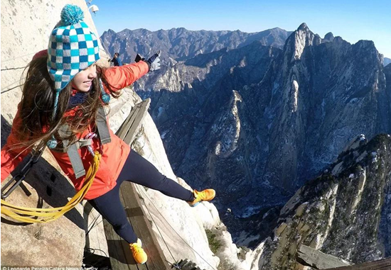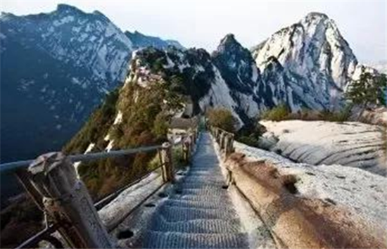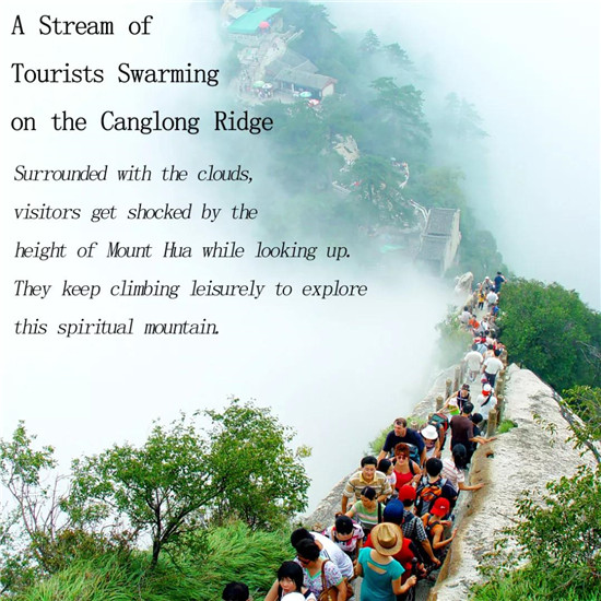 這是一個溫暖的美麗秋天,華山壯觀的峭壁在陽光下閃閃發(fā)亮,稀有樹木炫耀著多彩的秋葉,遠方跳躍的瀑布吸引著游客的眼球,奇形怪狀的點點白云在腳下緩緩流動。我和我的朋友開始了一場艱苦的旅行,一起攀登6,600多級鑿在巖石上的臺階,目標是海拔2154.9米南峰之巔祭祀華山神的道觀?! ?