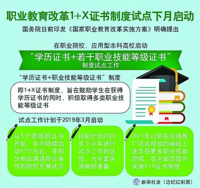 “職教20條”提出,從2019年開始,在職業(yè)院校、應(yīng)用型本科高校啟動(dòng)“學(xué)歷證書+若干職業(yè)技能等級(jí)證書”制度試點(diǎn)(以下稱1+X證書制度試點(diǎn))工作。試點(diǎn)工作要進(jìn)一步發(fā)揮好學(xué)歷證書作用,夯實(shí)學(xué)生可持續(xù)發(fā)展基礎(chǔ),鼓勵(lì)職業(yè)院校學(xué)生在獲得學(xué)歷證書的同時(shí),積極取得多類職業(yè)技能等級(jí)證書,提高就業(yè)創(chuàng)業(yè)本領(lǐng),緩解結(jié)構(gòu)性就業(yè)矛盾。
