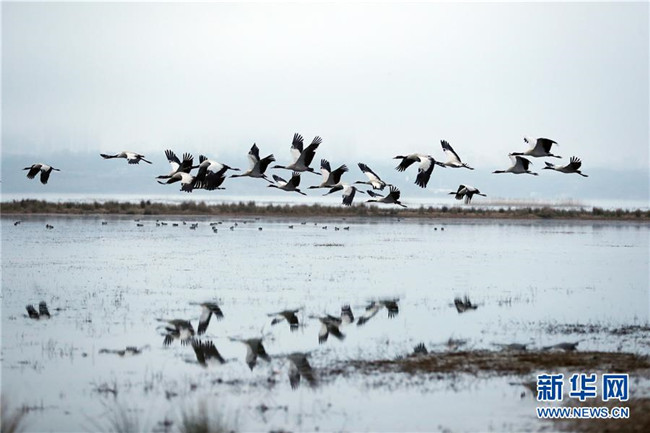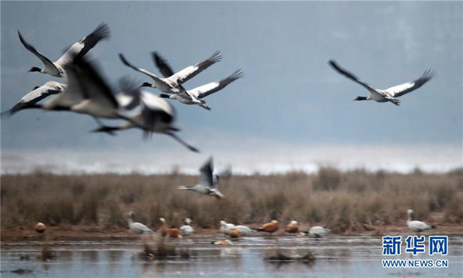 當(dāng)日,貴州省威寧彝族回族苗族自治縣草海國家級自然保護區(qū)內(nèi),黑頸鶴翩躚起舞、姿態(tài)萬千。