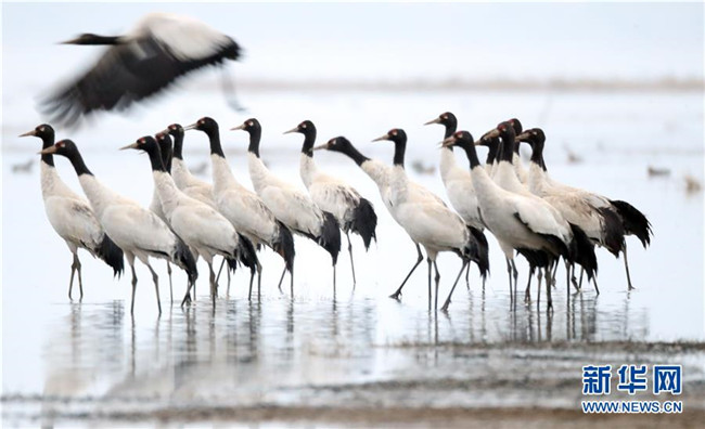 2月21日在草海國家級自然保護區(qū)內(nèi)拍攝的黑頸鶴。新華社發(fā)(韓賢普攝)