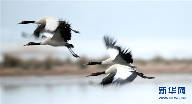 2月21日在草海國家級自然保護區(qū)內(nèi)拍攝的黑頸鶴。新華社發(fā)(胡攀學(xué)攝)