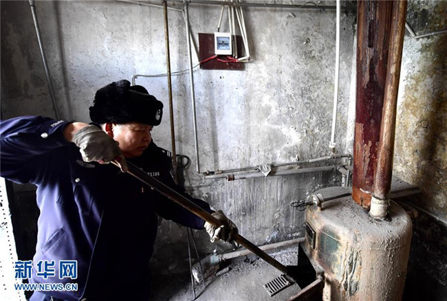2月21日,王建康在往鍋爐里加煤。