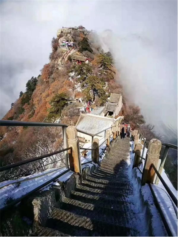 走進雪后的華山,你會覺得自己仿佛掉進了一個銀裝素裹的童話世界里,整個世界仿佛都被披上了一層白色婚紗。