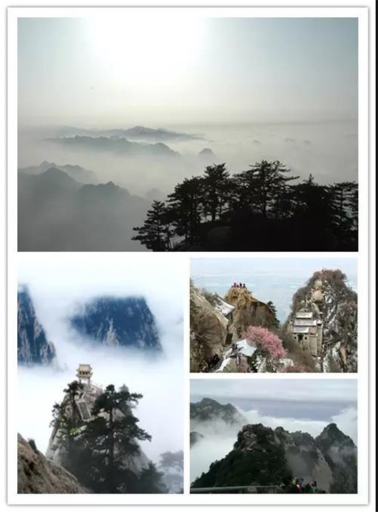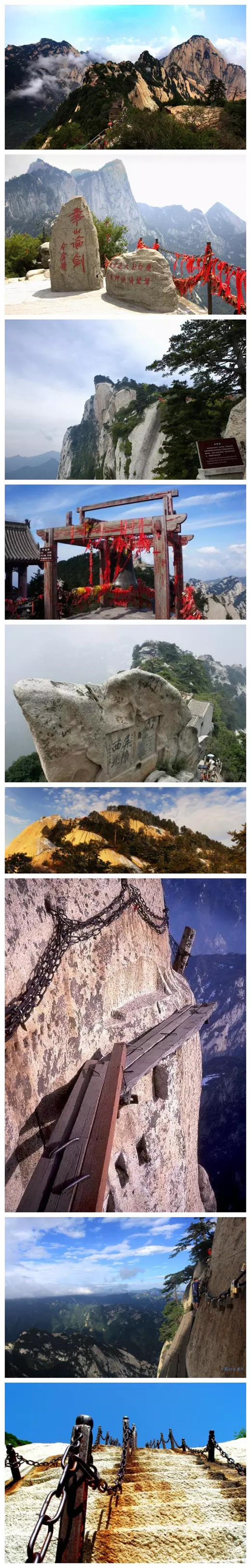 【圖2 北峰華山論劍碑、圖3 華岳仙掌、圖4南峰平安鐘、圖5 蒼龍嶺西北屏障、圖7、8長(zhǎng)空棧道】