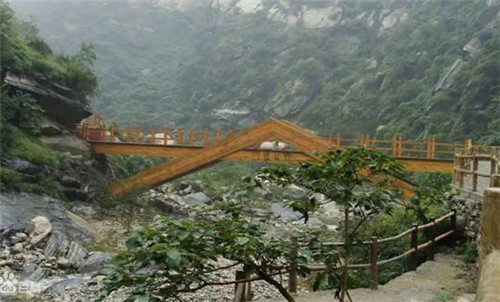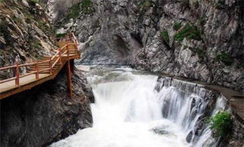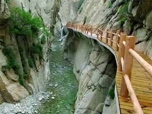 第二游:仙峪(仙峪,又名車箱谷,在華山峪西,與華山峪僅一嶺之隔,傳說古時黃初平、黃初起弟兄在此牧羊成仙,因而得名。仙峪深五十余里,峪道窄狹清幽,山路崎嶇蜿蜒,河流湍急,山石險(xiǎn)峻,多處路段鑿崖,加棧凌空通過。進(jìn)峪五里處,有斜嶺橫阻,令人有谷盡路絕之感,然越嶺橫度,又平添柳暗花明的情趣)。