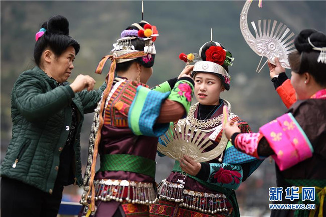 3月16日,在丹寨縣南皋鄉(xiāng)清江村,苗族姑娘為翻鼓節(jié)悉心打扮。 當日,貴州省黔東南苗族侗族自治州丹寨縣南皋鄉(xiāng)清江村清江村舉行翻鼓節(jié)。翻鼓節(jié)是當?shù)孛缱宕迕裼哟焊絹淼拿袼坠?jié)日,至今已有近600年歷史,每年農(nóng)歷二月舉行。 新華社記者 楊文斌 攝