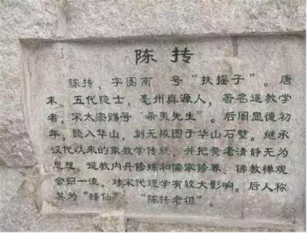 陳摶:陳摶(872年—989年),字“圖南”,號(hào)“扶搖子”、“希夷先生”(“希”指視而不見(jiàn),“夷”指聽(tīng)而不聞),常被視為神仙,尊稱為陳摶老祖、希夷祖師等。主張以睡眠,休養(yǎng)生息,時(shí)常一眠數(shù)日,人稱睡仙。相傳紫微斗數(shù)及無(wú)極圖說(shuō)皆為陳摶之創(chuàng)作。五代末,宋朝初期亳州真源(今河南鹿邑)人,著名華山派道士。