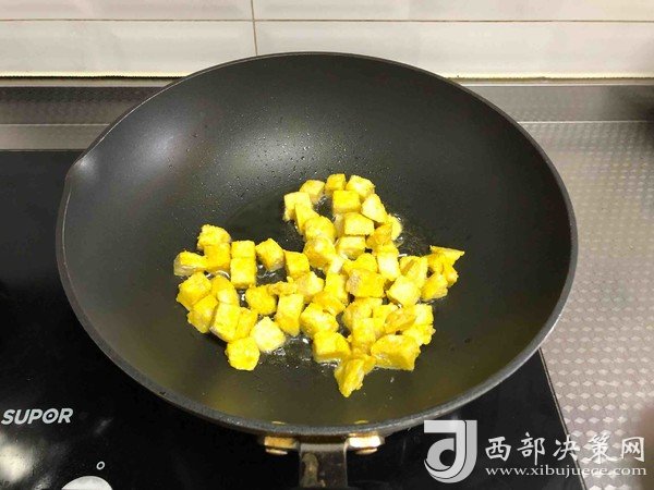 5.起鍋少量油,燒熱下饅頭粒翻炒均勻