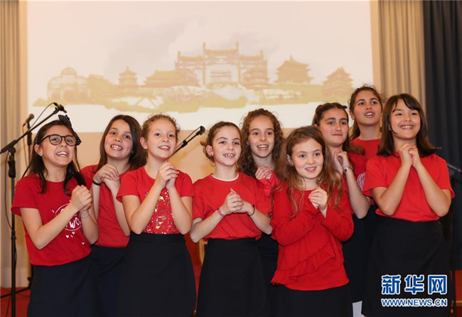 這是2019年2月8日,在意大利拉齊奧的古鎮(zhèn)蒂沃利,蒂沃利國(guó)立住讀學(xué)校的學(xué)生們?cè)谥袊?guó)春節(jié)慶祝活動(dòng)上給大家拜年。 新華社記者 程婷婷 攝