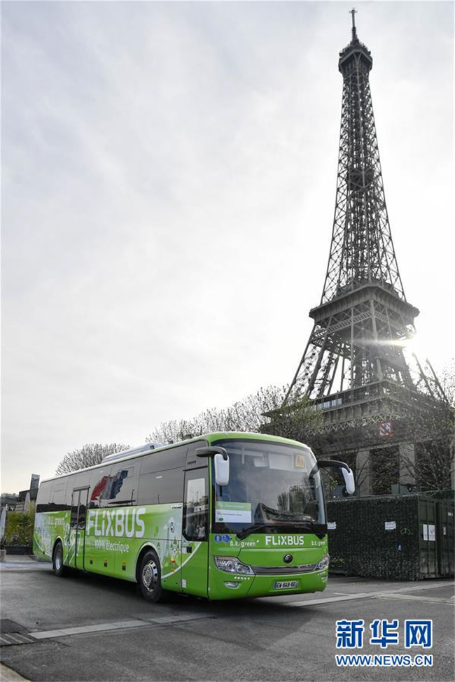 這是2018年4月10日在法國(guó)巴黎拍攝的中國(guó)宇通電動(dòng)客車。這輛59座電動(dòng)客車在法國(guó)巴黎至亞眠的城市間長(zhǎng)途客運(yùn)線路上運(yùn)營(yíng)。 新華社記者 陳益宸 攝