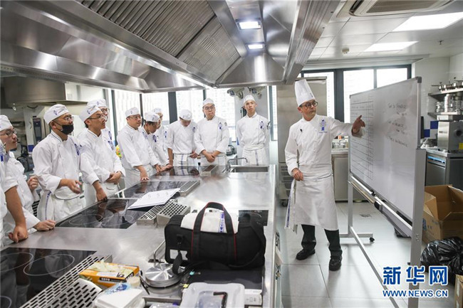 這是2018年10月17日, 來自法國(guó)的菲利普(右)在上海藍(lán)帶廚藝職業(yè)技能培訓(xùn)學(xué)校的教室內(nèi)給學(xué)員們教授法式廚藝。 新華社記者 丁汀 攝