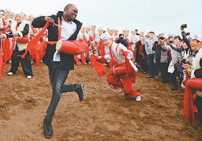 在陜西延安安塞區(qū)南溝進行的一場腰鼓演出結(jié)束后,一名外國游客與當(dāng)?shù)匮氖止餐蚱鹆搜?。新華社記者 劉 瀟攝
