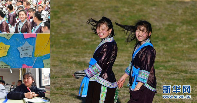 這是一張拼版照片:右圖為韋迎春(右)和同學在一起(2月6日攝);左上圖為韋迎春(中)在家鄉(xiāng)的“打同年”活動中(2月7日攝);左中圖為韋迎春在小卡紙上寫下的夢想(3月22日攝);左下圖為韋迎春在課堂上聽課(3月22日攝)。韋迎春來自融水苗族自治縣桿洞鄉(xiāng)堯告村,目前在融水民族高中讀高一。 新華社記者 黃孝邦 攝
