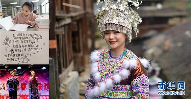 這是一張拼版照片:右圖為楊琳詩瑤(2月16日新華社記者黃孝邦攝);左上圖為楊琳詩瑤在學校圖書館里學習(3月23日攝,楊琳詩瑤供圖);左中圖為楊琳詩瑤在紙上寫下的夢想(3月23日攝,楊琳詩瑤供圖);左下圖為楊琳詩瑤(右)在家鄉(xiāng)主持苗寨的春節(jié)聯(lián)歡晚會(2月10日新華社記者黃孝邦攝)。楊琳詩瑤是融水苗族自治縣桿洞鄉(xiāng)桿洞村的苗族姑娘,去年以優(yōu)異成績考上廣西民族大學。  新華社發(fā)
