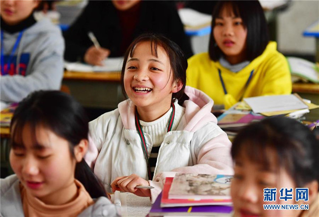 韋蓮秀(中)在課堂上(3月13日攝)。韋蓮秀來自融水苗族自治縣桿洞鄉(xiāng)百秀村,目前在桿洞中學讀初中。 新華社記者 黃孝邦 攝