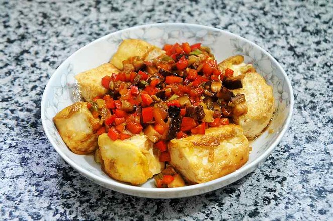 主料:豆腐10小塊 紅椒半個(gè) 青椒半個(gè) 香菇2朵