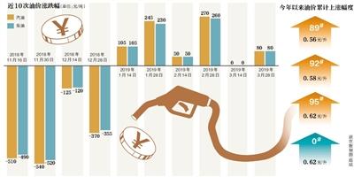據(jù)新京報(bào)記者統(tǒng)計(jì),本輪油價(jià)上漲之后,今年以來(lái)我國(guó)汽油、柴油每噸總上調(diào)幅度已分別達(dá)750元及725元。與2018年年末相比,此次上調(diào)之后,每升89號(hào)汽油累計(jì)漲價(jià)0.56元、92號(hào)汽油漲價(jià)0.58元、95號(hào)汽油漲價(jià)0.62元、0號(hào)柴油則漲價(jià)0.62元。