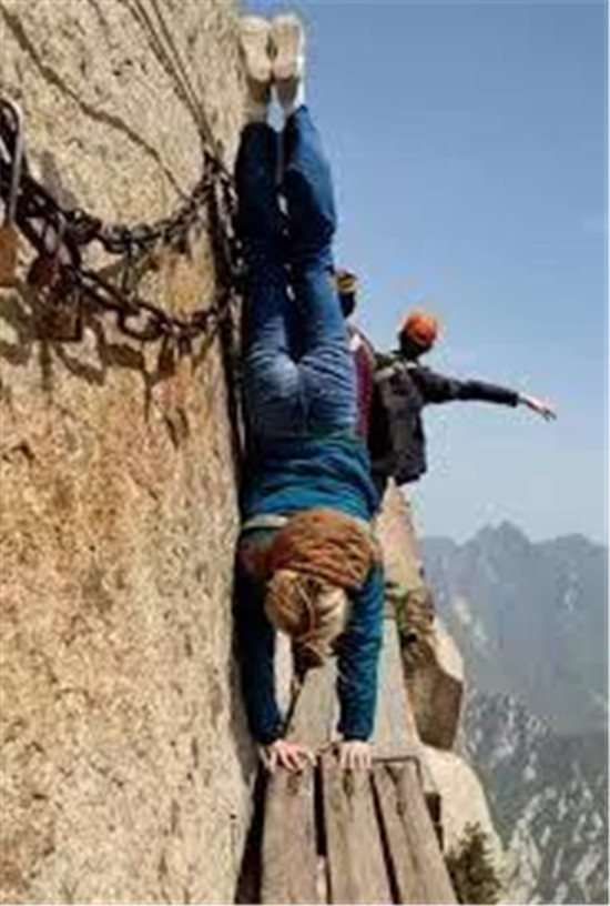 譯:這些令人暈眩的照片,拍的是中國陜西省一座旅游名山的游客正在通過建在峭壁上的極其狹窄且危險(xiǎn)的棧道。