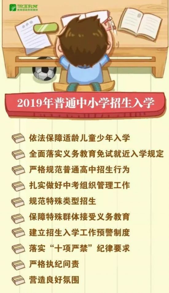 教育部辦公廳印發(fā)《關(guān)于做好2019年普通中小學招生入學工作的通知》?!锻ㄖ诽岢鲆婪ūU线m齡兒童少年入學、全面落實義務教育免試就近入學規(guī)定、嚴格規(guī)范普通高中招生行為、建立招生入學工作預警制度、嚴格執(zhí)紀問責等要求。