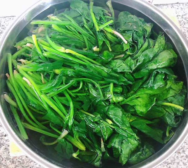 3.焯好水的菠菜立即放入冷水中過(guò)涼后瀝干水份
