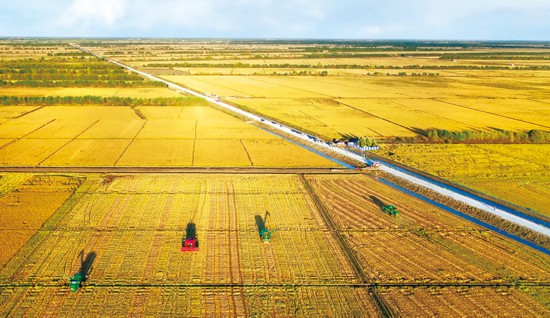 中國(guó)人要把飯碗端在自己手里,而且要裝自己的糧食。改革開(kāi)放40多年來(lái),我國(guó)農(nóng)業(yè)農(nóng)村現(xiàn)代化建設(shè)取得重要進(jìn)展,農(nóng)業(yè)物質(zhì)技術(shù)裝備水平不斷提高,確保糧食安全的基礎(chǔ)更加牢固。黑龍江是我國(guó)糧食生產(chǎn)大省,2018年糧食產(chǎn)量超過(guò)1500億斤,實(shí)現(xiàn)“十五連豐”。圖為無(wú)人機(jī)航拍的大型農(nóng)機(jī)在黑龍江省三江平原一處稻田收割水稻。 新華社記者 王建威/攝