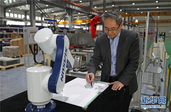 3月29日,沈陽(yáng)新松機(jī)器人自動(dòng)化股份有限公司創(chuàng)始人兼總裁曲道奎和公司生產(chǎn)的機(jī)器人共同書寫“愛(ài)國(guó)奮斗”字樣。 新華社記者 楊青 攝