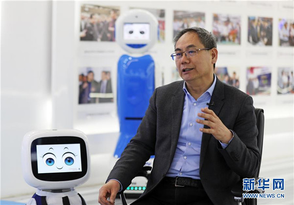 3月29日,沈陽(yáng)新松機(jī)器人自動(dòng)化股份有限公司創(chuàng)始人兼總裁曲道奎和公司生產(chǎn)的機(jī)器人互動(dòng)。 新華社記者 楊青 攝