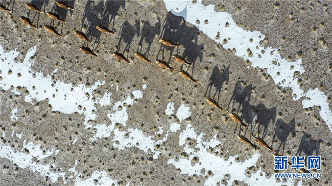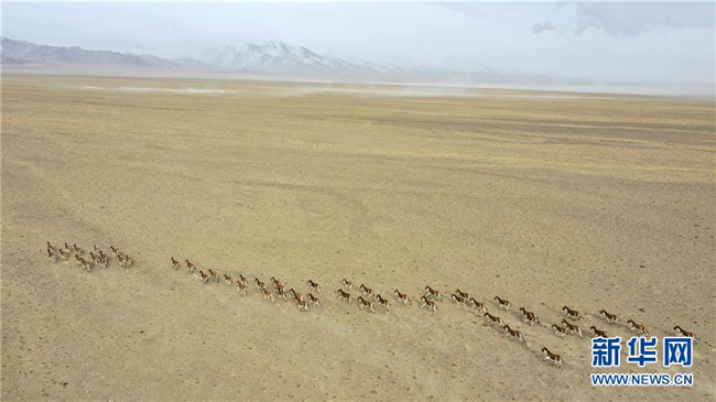 阿爾金山國(guó)家級(jí)自然保護(hù)區(qū)內(nèi)的藏野驢(4月2日無(wú)人機(jī)拍攝)。 新華社記者 胡虎虎 攝