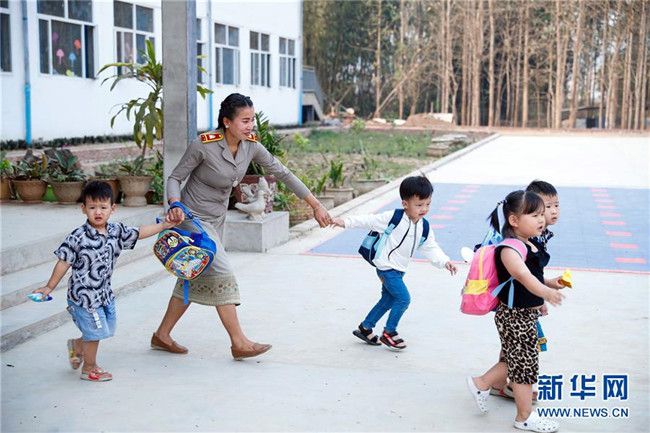 3月22日,在老撾孟賽的中老友誼學(xué)校,一名老師將幼兒園的學(xué)生送出校門(mén)。新華社記者 王婧嬙 攝