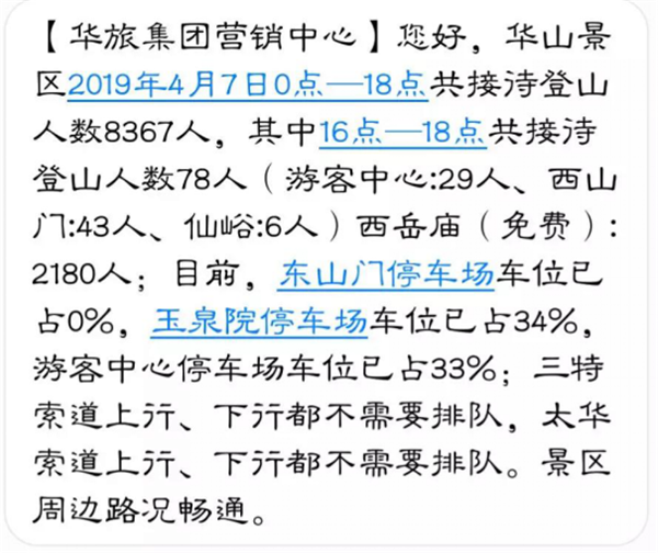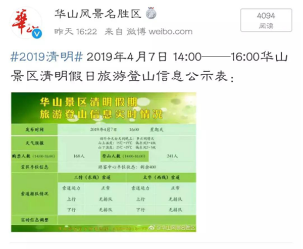 景區(qū)節(jié)日期間通過電子大屏、官方微博、微信、短信平臺向游客和各單位提供實時登山排隊人數、車位、天氣等信息。(小長假期間新浪微博共計發(fā)送微博48條,網友留言及回復361條,閱讀量共計421446余次;微信公眾平臺共計發(fā)送18篇軟文報道,分享及轉發(fā)量共計1098次,閱讀量共計10272次;短信平臺共計發(fā)送2394條短信,及時匯報各項旅游信息)。