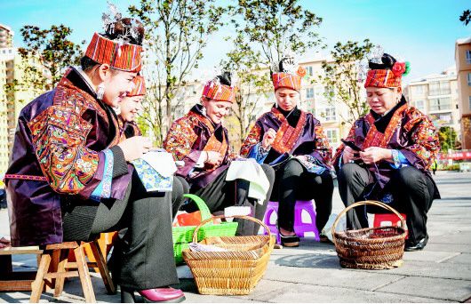 圖1:公交車開(kāi)進(jìn)凱里市上馬石易地扶貧搬遷安置小區(qū)。圖2:凱里市上馬石易地扶貧搬遷安置點(diǎn)廣場(chǎng)上的繡娘。(凱里市宣傳部供圖)