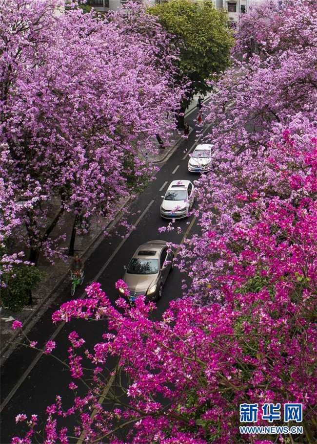 當(dāng)日,一場大雨過后,廣西柳州市內(nèi)的洋紫荊開得格外嬌艷。時(shí)下,柳州市區(qū)27萬株洋紫荊進(jìn)入盛花期。 新華社記者 黃孝邦 攝
