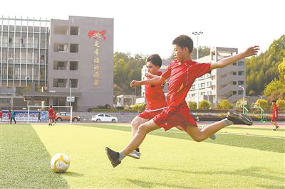 日前,湖北省武漢市英山縣思源實驗學(xué)校綠茵操場上,學(xué)生正在進(jìn)行攔截?fù)屒蛴?xùn)練。為了培養(yǎng)學(xué)生的足球興趣,該校開展了“陽光足球大課間”體育活動,倡導(dǎo)全體師生充分享受課間足球運動。(單藝偉/攝)