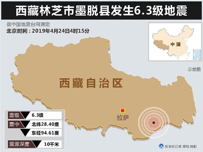 4月24日4時(shí)15分,在西藏林芝市墨脫縣(北緯28.40度,東經(jīng)94.61度)發(fā)生6.3級地震,震源深度10千米。林芝消防力量已趕赴震中應(yīng)急處置,向當(dāng)?shù)亓私獾那闆r顯示,中心區(qū)域震感強(qiáng)烈。(記者葉昊鳴)