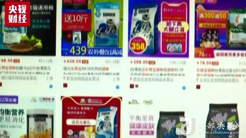 在網(wǎng)購平臺搜索寵物日常糧食用品,商品數(shù)量可達上百頁。銷量最好的貓糧,月銷售量達到6.5萬筆。