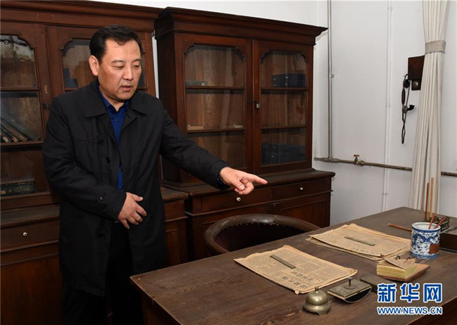 北京新文化運動紀念館副館長李金光在北大紅樓中介紹當年圖書館主任李大釗的辦公室(4月9日攝)。新華社發(fā)(任超 攝)