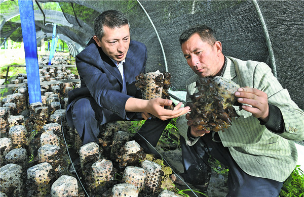 4月30日,新疆烏什縣委組織部駐阿克托海鄉(xiāng)庫木奇吾斯塘村“訪惠聚”工作隊隊員艾克熱木·艾麥提(左)在工作隊建立的黑木耳種植示范基地,為該村貧困戶講解黑木耳種植技術。約提克爾·尼加提 攝