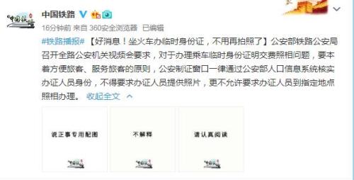 據(jù)中國鐵路總公司官方微博消息,公安部鐵路公安局召開全路公安機(jī)關(guān)視頻會要求,對于辦理乘車臨時身份證明交費(fèi)照相問題,要本著方便旅客、服務(wù)旅客的原則,公安制證窗口一律通過公安部人口信息系統(tǒng)核實辦證人員身份,不得要求辦證人員提供照片,更不允許要求辦證人員到指定地點(diǎn)照相辦理。