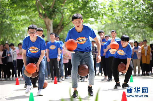 5月14日,河北省石家莊新樂市第二中學高三學生在進行趣味運球比賽。 新華社發(fā)(賈敏杰 攝)