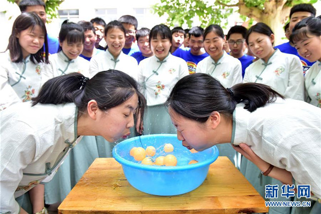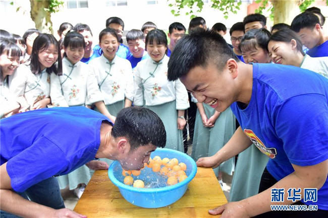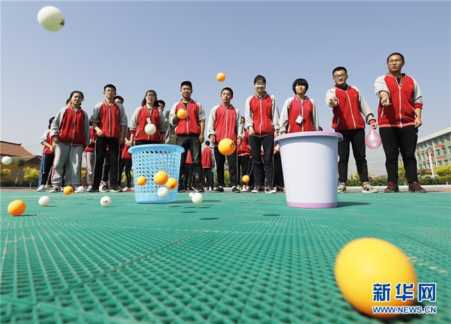 5月14日,河北省唐山遵化市堡子店中學高三學生在進行投乒乓球游戲。 新華社發(fā)(劉滿倉 攝)