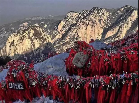 華山的金鎖關(guān)建在三峰口的一座石拱門處,關(guān)北接五云峰,南控華山主峰,東西兩側(cè)壑深千丈,是名副其實的咽喉要道。杜甫《望岳》詩中“箭栝通天有一門”指的就是這里。道家認為,華岳為仙鄉(xiāng)神府,只有過了通天門,才算進入仙境,所以便有“過了金鎖關(guān),另是一重天”的民謠。