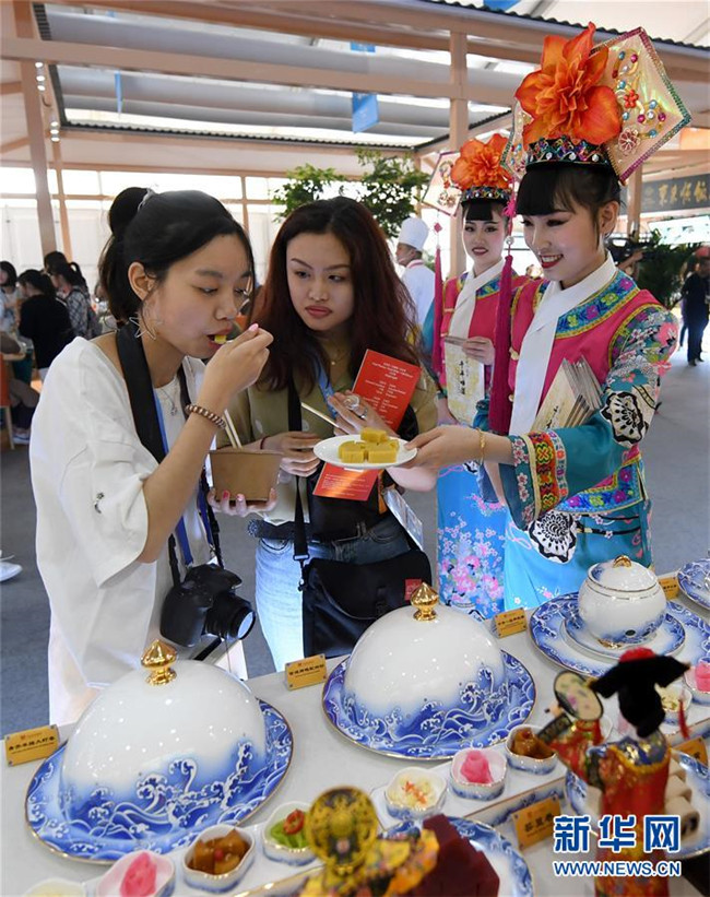 5月16日,在北京奧林匹克公園,參觀者品嘗北京風(fēng)味小吃。新華社記者 王毓國 攝